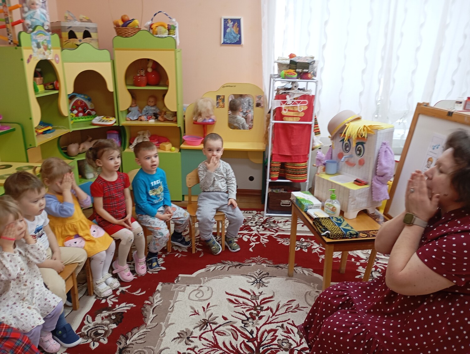 В рамках недели здоровья у нас прошел "День чистюлька". Мы с ребятами прочитали стих А. Барто "Девочка чумазая" и побеседовали как плохо быть грязным. К нам в гости пришел Мойдодыр и рассказал как правильно умываться. Мы поиграли в игру "Разложи мыло по мыльницам" и вместе с Мойдодыром выучили потешку "Водичка, водичка"