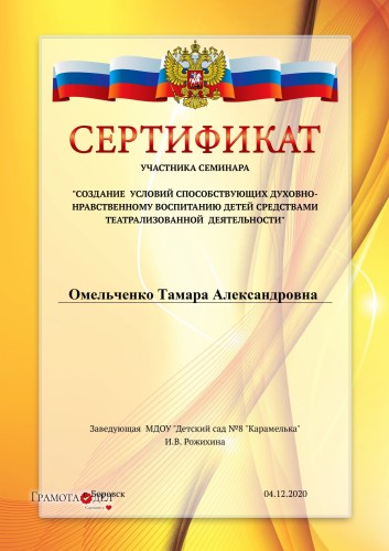 4 декабря участвовала в семинаре «Создание условий способствующих духовно-нравственному воспитанию детей средствами театрализованной деятельности», который организовали и провели педагоги МДОУ «Детский сад №8 «Карамелька». Спасибо коллеги. | |