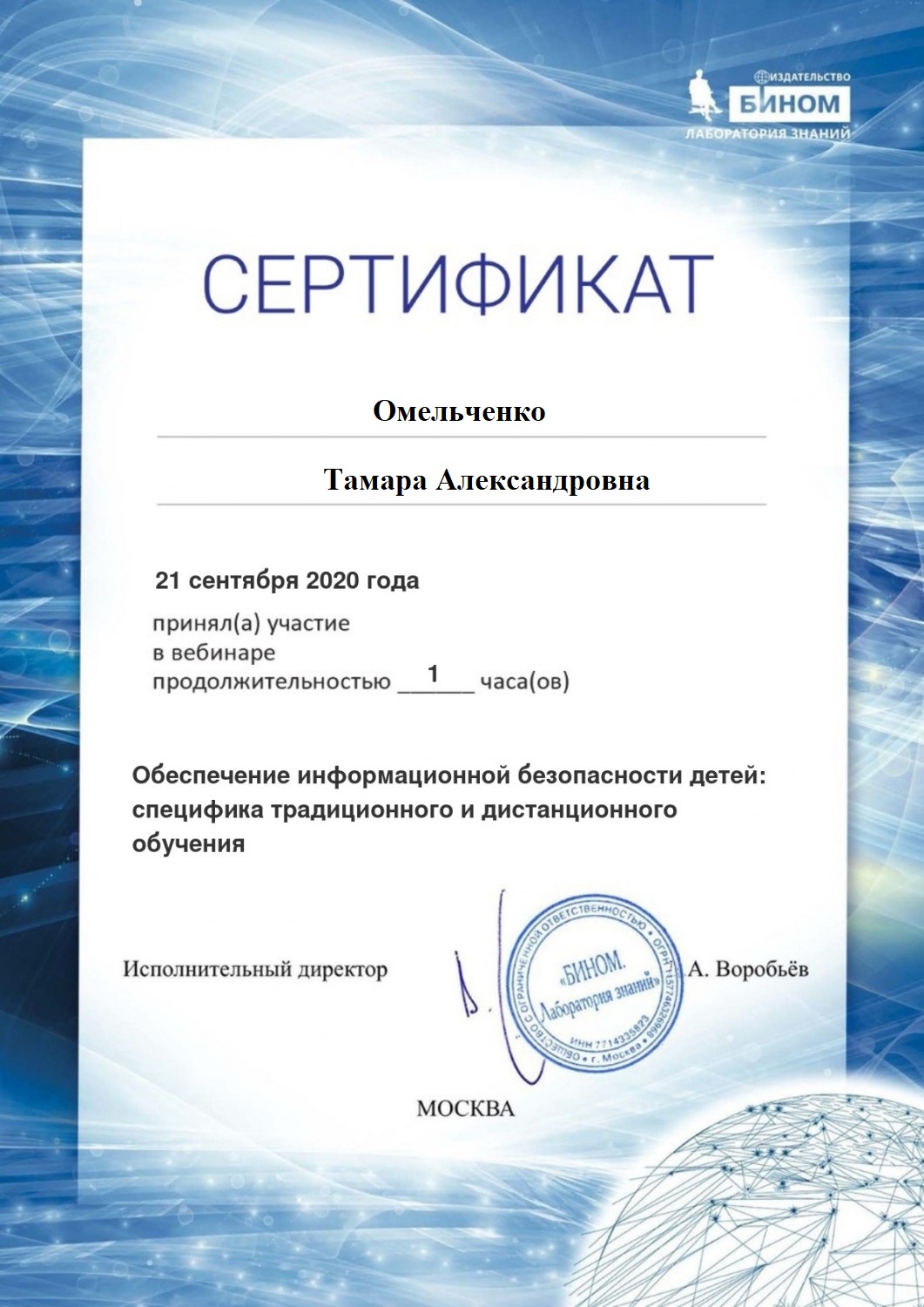 21 сентября приняла участие в вебинаре на тему: "Обеспечение информационной безопасности детей: специфика традиционного и дистанционного обучения"