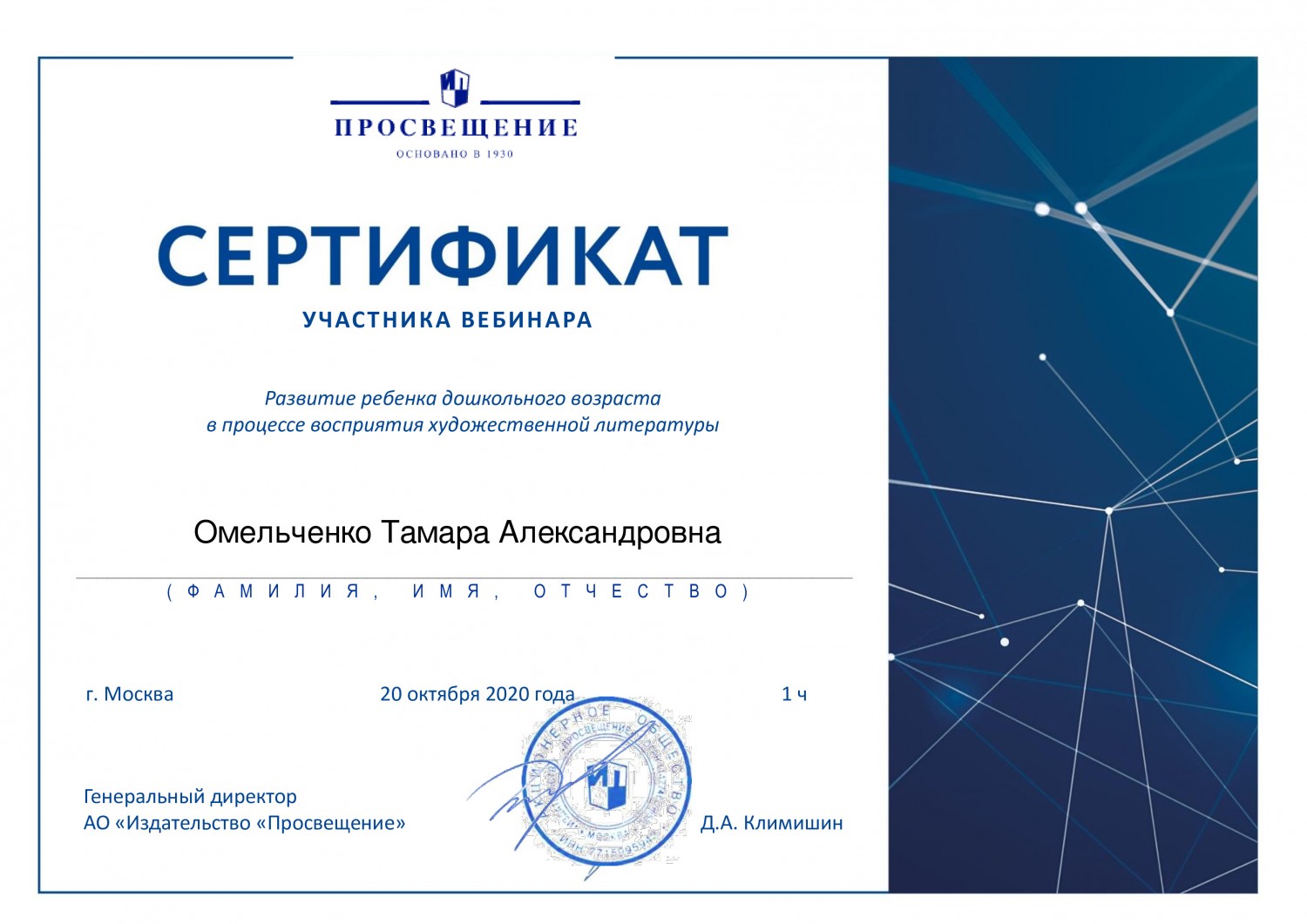 20 октября приняла участие в вебинаре на тему: "Развитие ребенка дошкольного возраста в процессе восприятия художественной литературы".